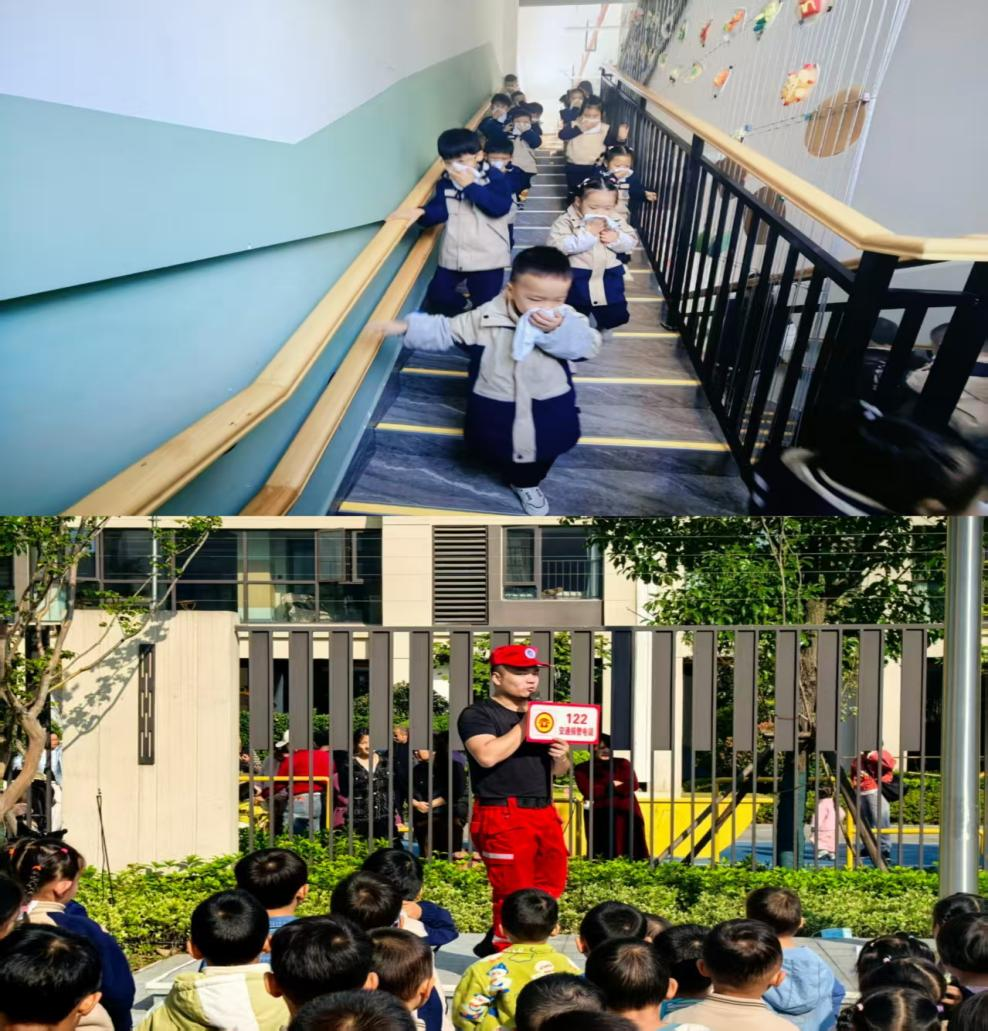 与此同时,消防疏散演练同步启动。在警报声拉响的那一刻,全园幼儿在班级老师组织下用湿毛巾捂住口鼻、弯腰低姿,沿着预设安全路线在模拟烟雾中快速撤离至操场安全地带,全程紧张有序、无拥挤踩踏情况,展现出良好的应急应变能力。