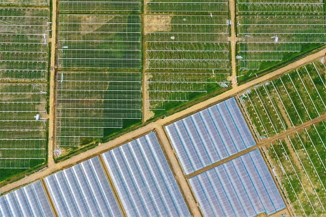 在光伏农场所在的柳树洼村,农民在采摘辣椒(8月19日摄,无人机照片)。 2021年底,随着陕西洛南100兆瓦光伏农业与观光旅游综合利用示范项目并网,昔日商洛市洛南县2800亩的一片坡塬,变成了农光互补的新能源基地。 该光伏农场每年为项目所在地4个村分红,将光伏场区土地经营权移交至项目所在地村集体,并提供农业启动金,打造种植示范区,修建旅游观光台,形成地上发电、地面农业、厂区观光的三产融合模式。